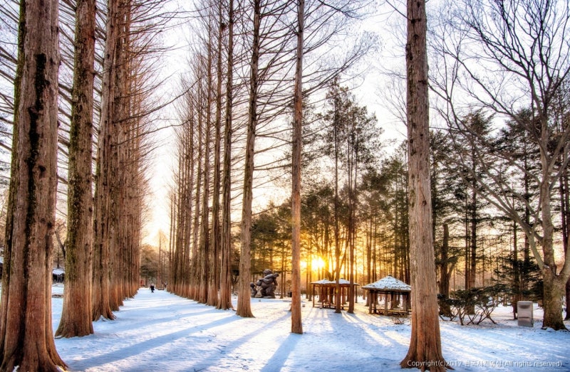 남이섬 겨울엔 눈 덮인 메타세쿼이아길 산책,